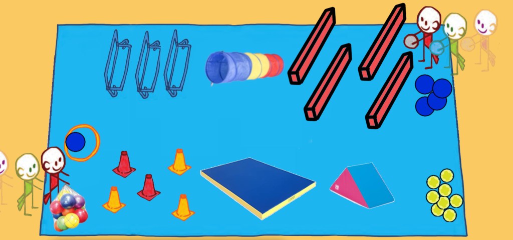 | – 5 Balles de yoga lestées – Un grand filet – 10 Ballons jaunes – Matelas épais – Tapis Monticule – Plots – Haies – Tunnel – Briques RIWI | – Slalomer – Courir – Trainer – Grimper – Sauter |