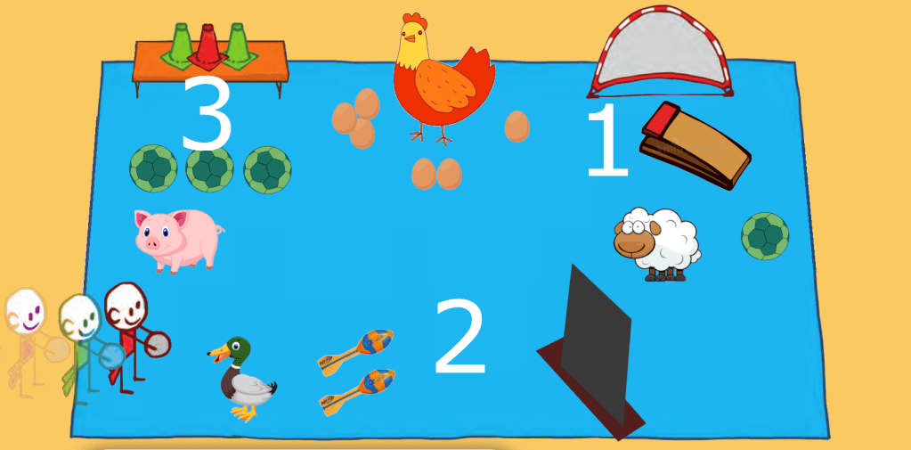 L’ enfant commence par le parcours 3. S’il réussit à faire tomber les 3 plots avec les 3 ballons, il récupère 3 œufs et les apporte à son parent qui les dépose dans les boites à œufs.