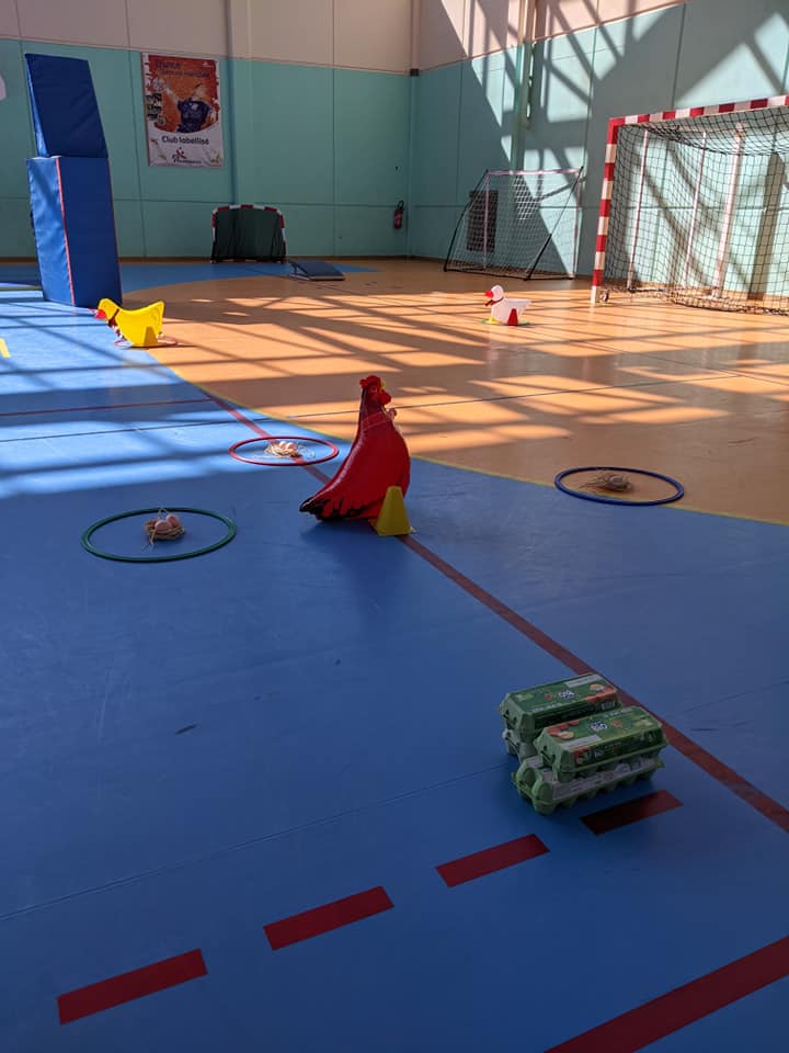 | – 3 animaux gonflables en forme d’animaux. – 2 fusées vortex – 60 œufs en plastique – 1 but popup – 4 ballons – 1 obstacle 1m50 de hauteur – 1 tremplin – 1 banc – 3 plots – Boites œufs vides | – Viser – Lancer – Sauter – Tirer – Compter – Faire les 3 pas |