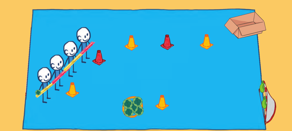 Arrivée à la fin du parcours, la balle est déposée dans le carton par le dernier enfant.