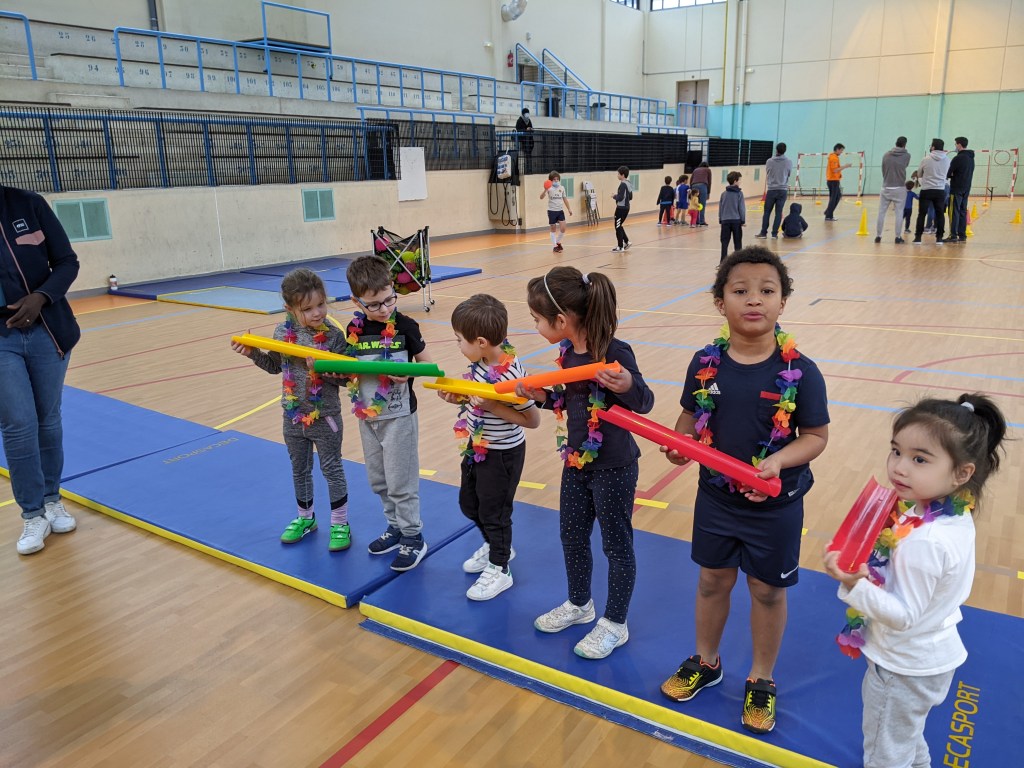 Une fois la balle déposée, l’enfant court à la fin de la file pour poursuivre le relais.