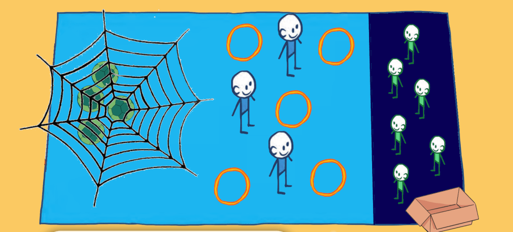 Au signal, les enfants, 3 par 3, se dirigent en même temps vers la toile d’araignée. Si un enfant est touché, il retourne dans la « zone enfant ».