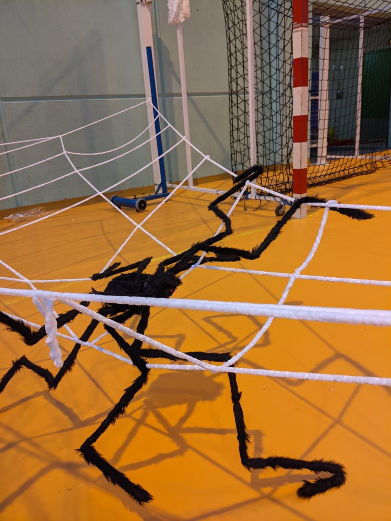 Chacun leur tour, un enfant prend un oeuf d’arraignée, saute les haies, tir au but. Si il marque, un bonbon est posé dans le chaudron et sera distribué à la fin de la séance.