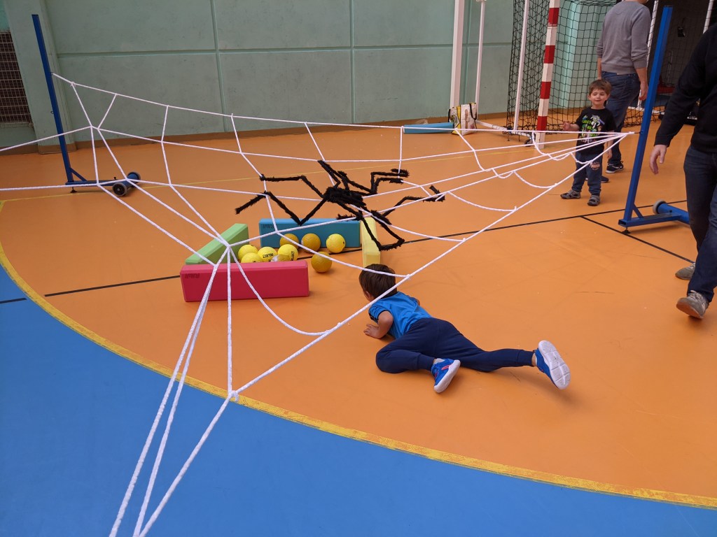 Une fois sous la toile d’araignée, l’enfant doit prendre un ballon et le déposer dans le carton.