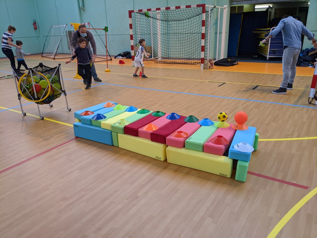 Réaliser un parcours composé de quelques haies, quelques cerceaux, quelques plots, un tramplin, un grand tapis épais et un but en fin de parcours.