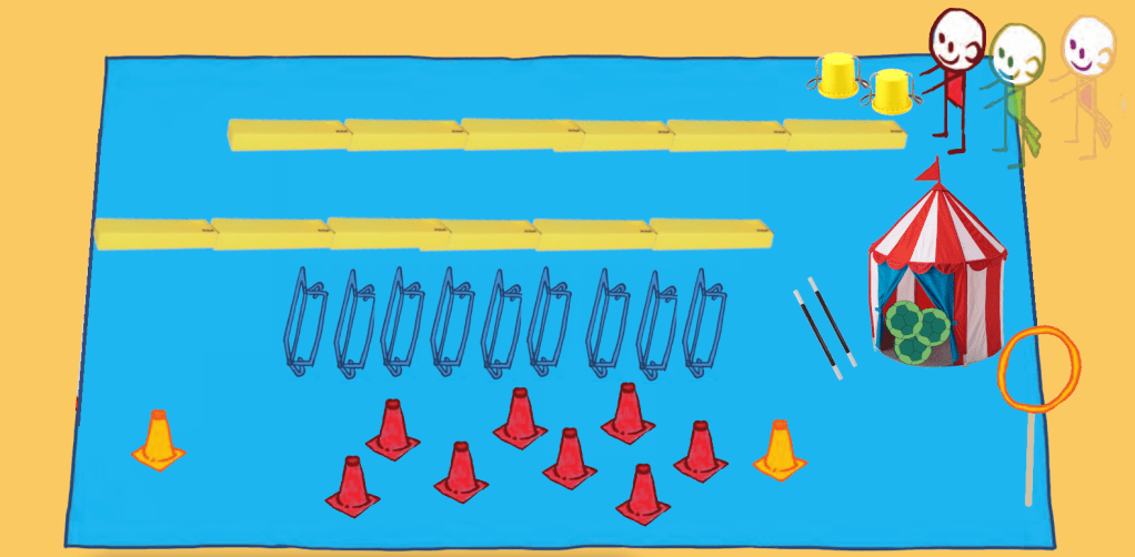 | 10 haies 10 ballons 20 briques Riwi 1 cerceau 15 plots 16 baguettes magiques Une barre avec socle Echasses | Viser Equilibrer tirer |