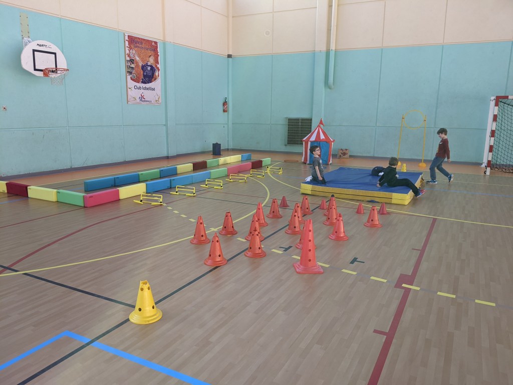Puis, l’enfant se fait un chemin dans le parcours de plots.
