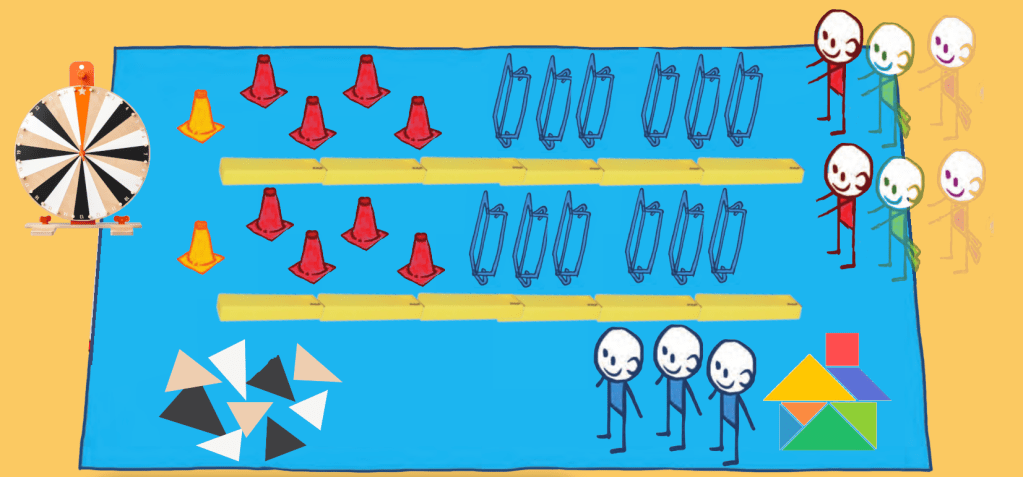 | 12 haies 10 modèles de tangram 20 brique Riwi 2 plots jaunes 15 plots rouges 1 roue de la chance Un grand nombre de formes tangram en carton | Sauter Choisir Slalommer |