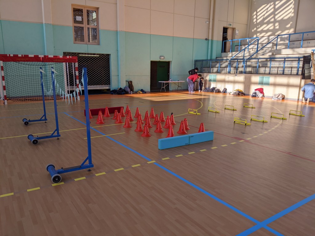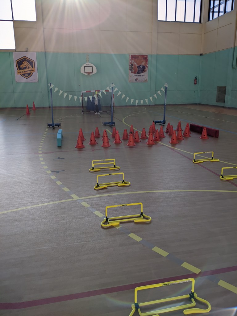 Au signal, un enfant de chaque équipe commence le parcours. Il doit sauter par dessus les haies puis slalommer entre les plots.