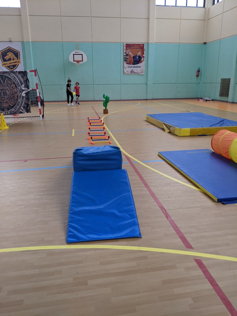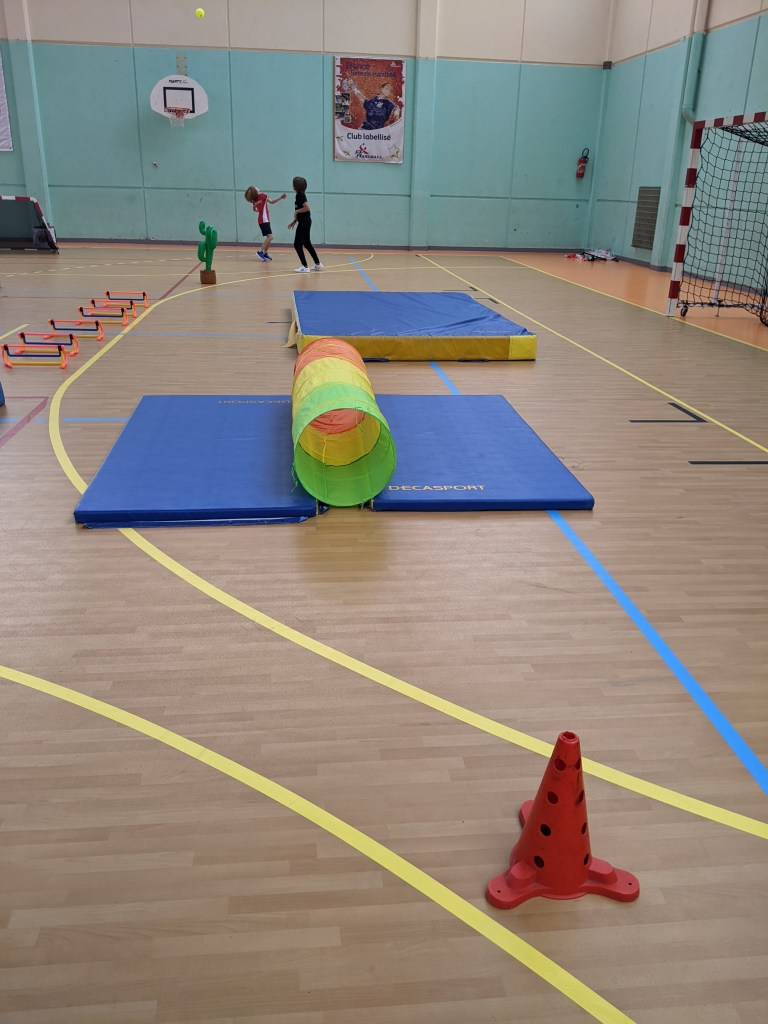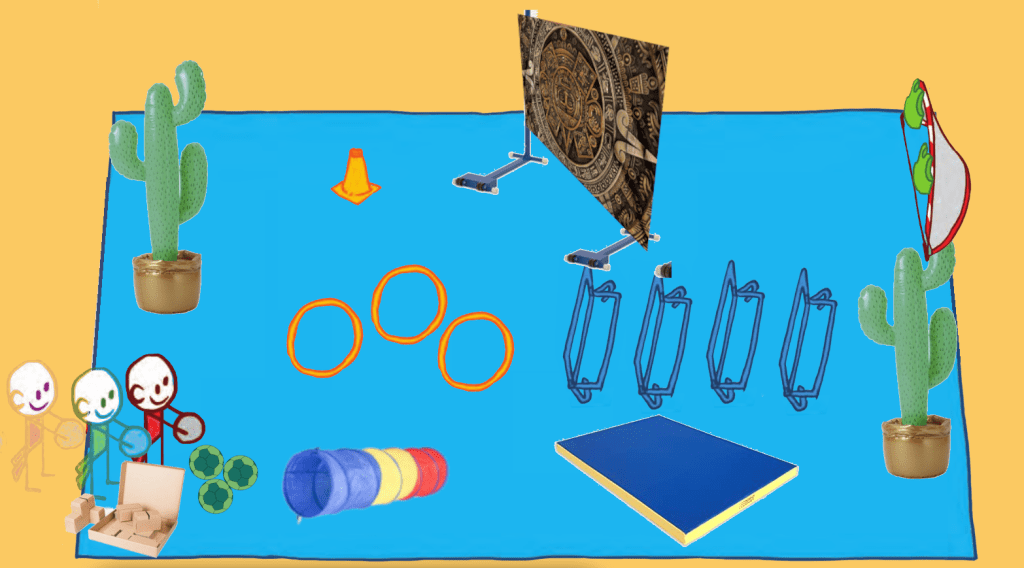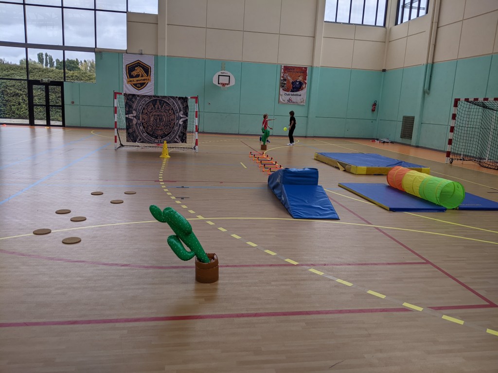 | 2 cactus gonflables 4 haies Un tunnel une boite de légo géant en carton 3 cerceaux Un tapis épais Un but Un tissus tendu sur 2 pieds 8 ballons | Courir Sauter Lancer Viser Ramper |