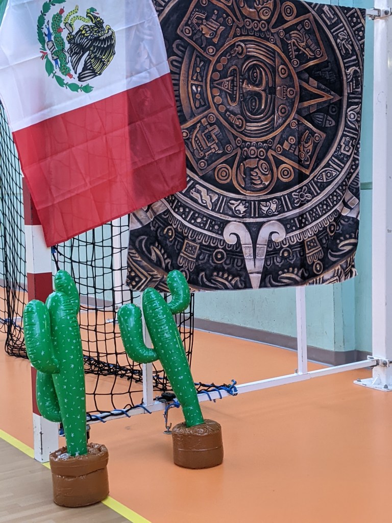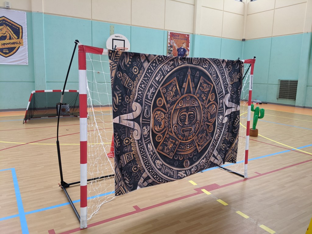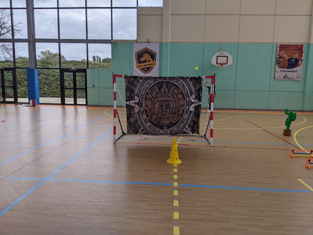 Une fois arrivée sur le plot jaune, l’enfant devra tirer au but en lançant le ballon par dessus le drap aztèque.