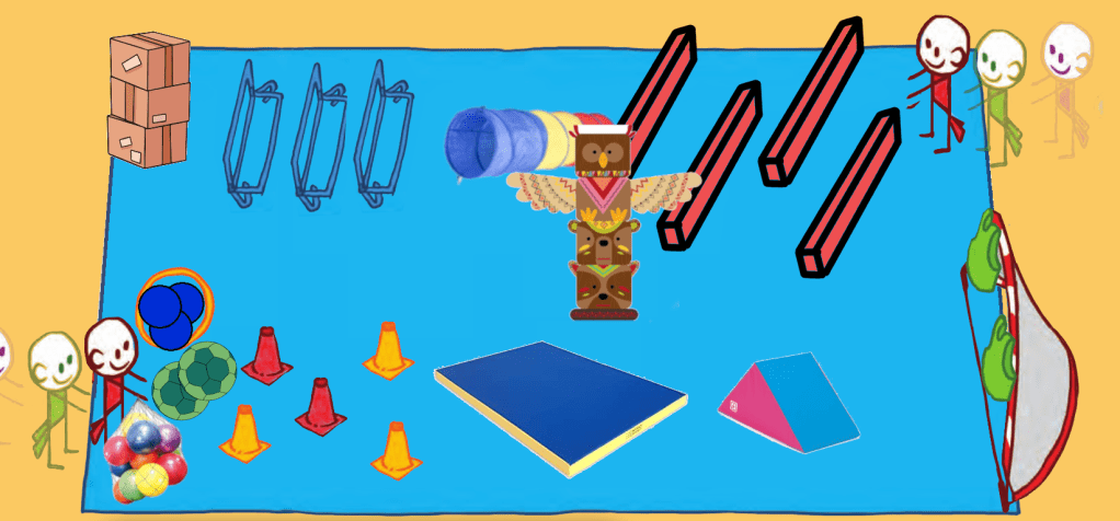 A tour de role, chaque enfant réalise le parcours. Il récupère un carton puis le dépose au milieu du village en les empilant pour former un totem.