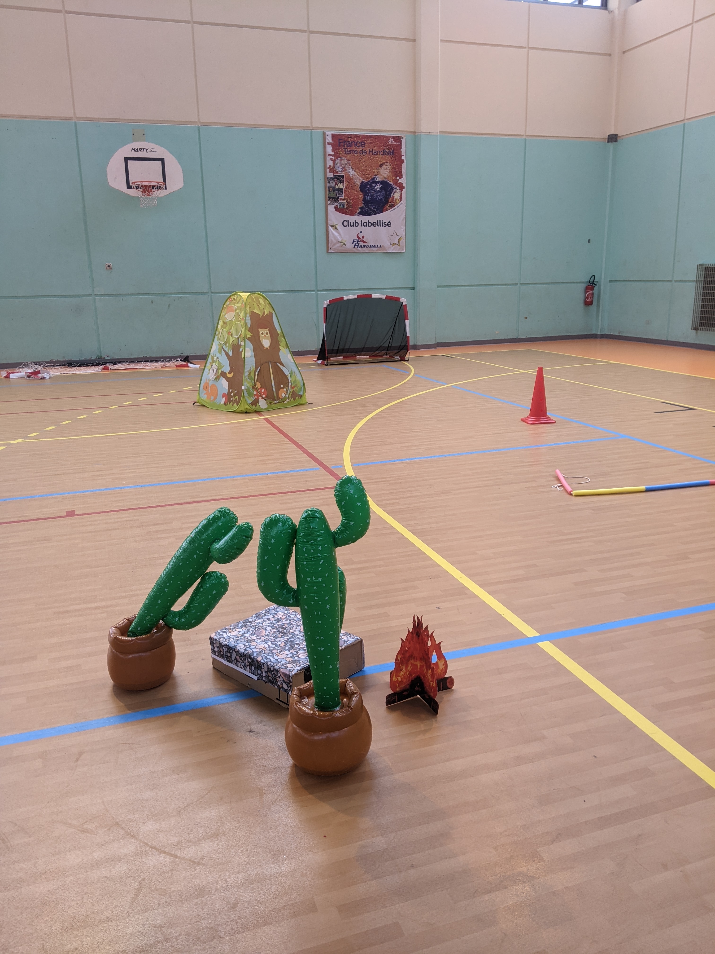Les enfants devront trainer en même temps le filet a travers les obstacles du parcours. A la fin du parcours, les enfants tire a tour de rôle dans le but avec un ballon jusqu’à marquer un bur. Une fois le but marqué, ils récupèrent une plume et la plante dans le totem.