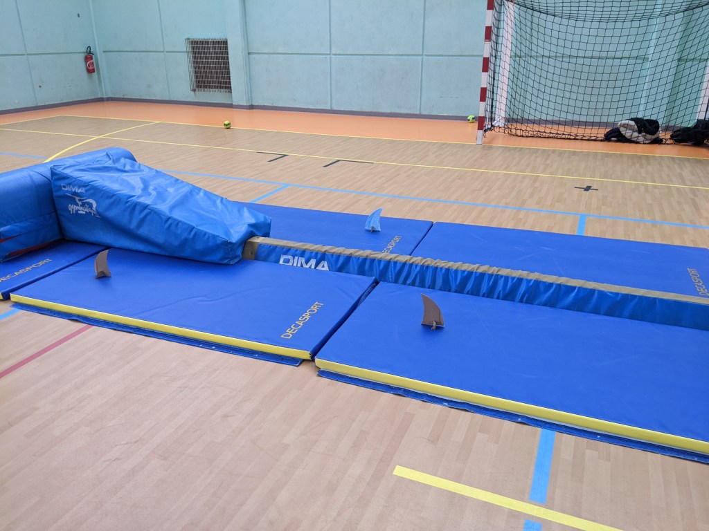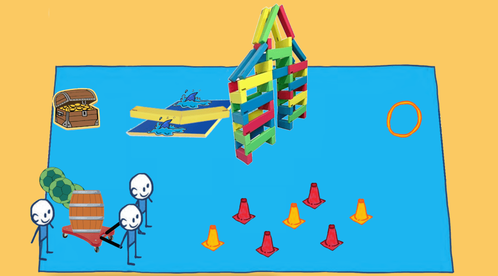 Derrière les tours, déposer des tapis de gym pour représenter la mer et aligner 2 bancs au dessus.