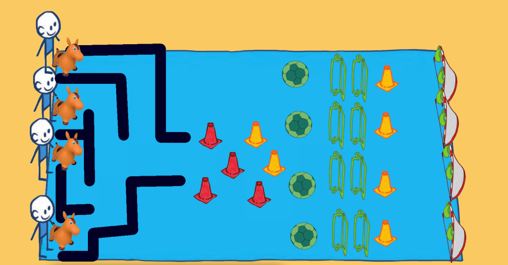 L’enfant saute ensuite les haies et tire au but. Il recommence jusqu’à ce que le but soit marqué.