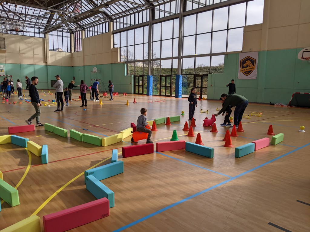 Au signal de l’entraineur, chaque enfant monte sur le cheval sauteur et doit sortir du labyrinthe au plus vite.