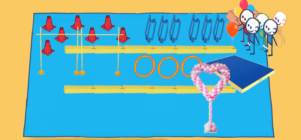 | 30 ballons de baudruche Une arche en forme de coeur 8 haies 2 poteaux et une barre 5 cerceaux Un tapis épais 10 plots Attaches pied Briques Riwi pour délimiter les zones | Motricité Coordination |