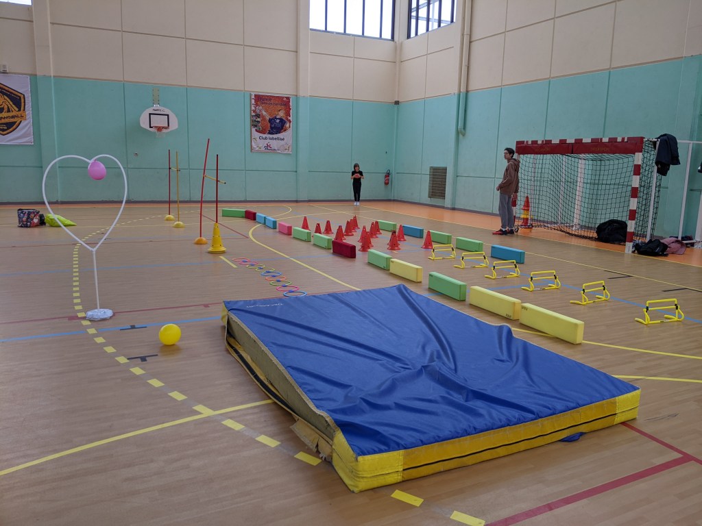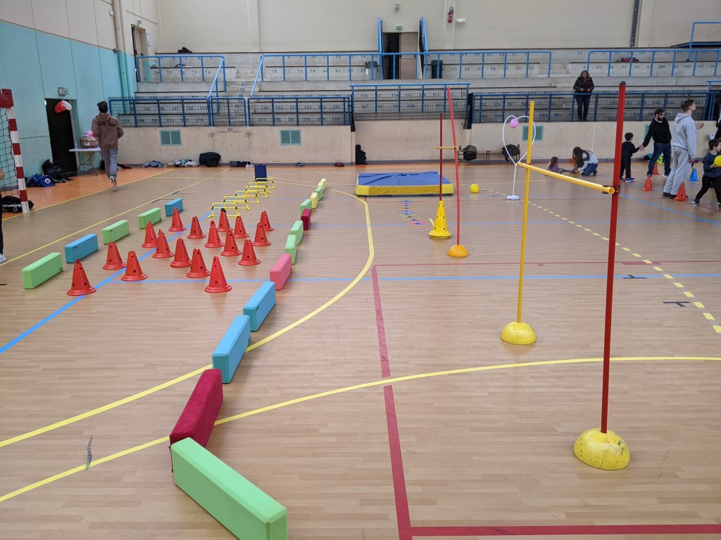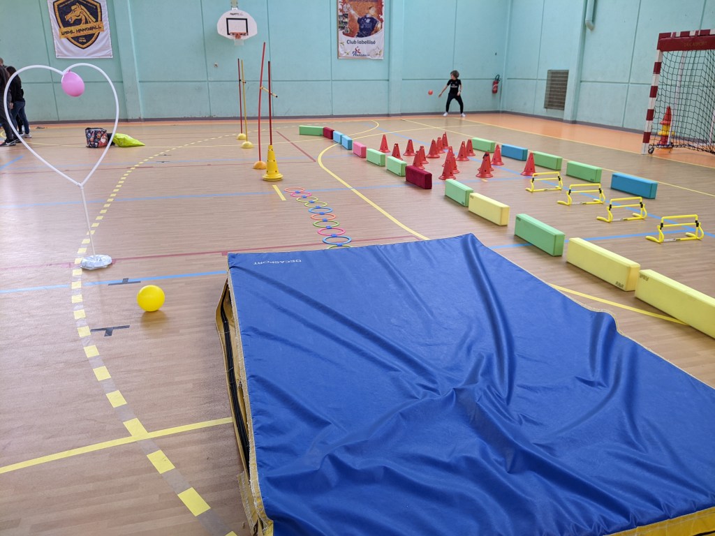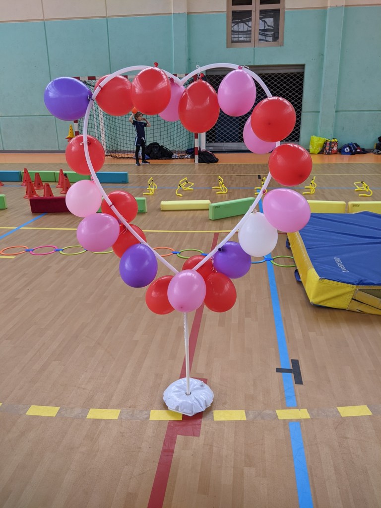 Au signal de l’entraineur, l’enfant prend un ballon de baudruche et effectue le parcours avec l’aide de son parent.