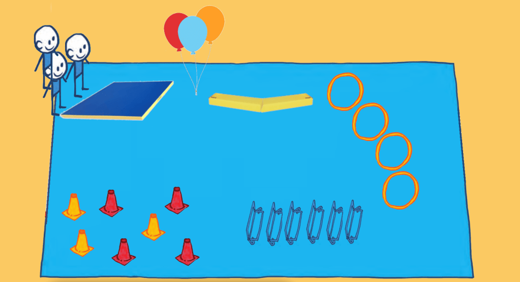 L’enfant réalise ensuite le parcours avec son ballon à la main et puis pose son ballon sur un plot de la même couleur que celui-ci.