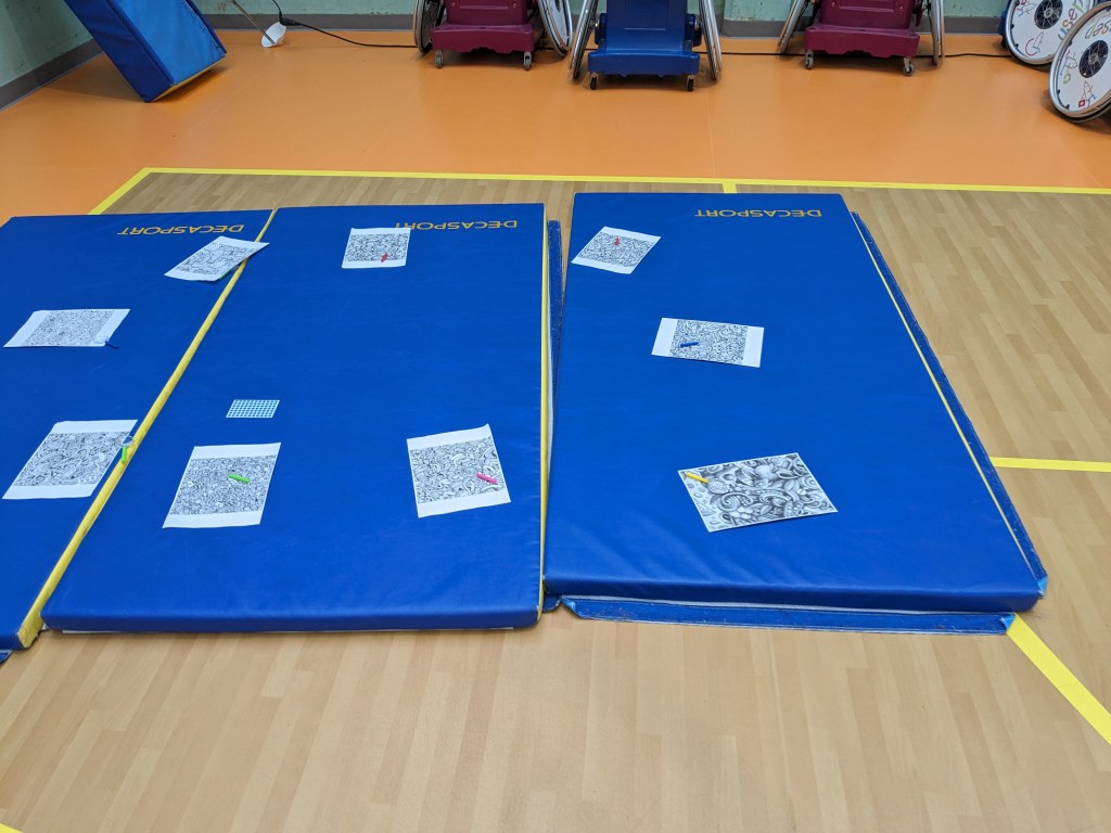 Chaque enfant prend une loupe et doit chercher un ballon dans le coloriage au sol. Une fois trouvé, il colle une gommette dessus et prend un ballon à l’hélium.